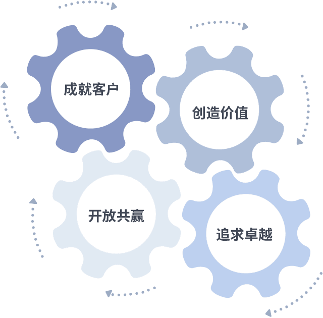 成就客户是一切决策的出发点,,,,创造价值是衡量所有工作的标准,,,,追求卓越是我们做事做人的态度,,,,开放共赢是我们的格局也是最终的结果。。价值观的齿轮环环相扣,,,推动着组织里的每个人不断向前。。。